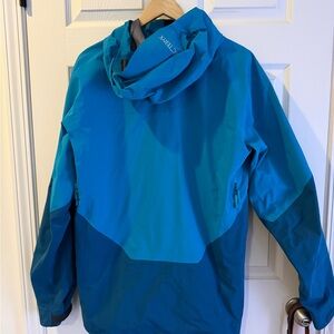 Arc'teryx jacket with a two-tone teal and navy design. Features a hood and front zippers.