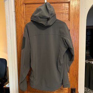 Selling my arct'eryx soft shell jacket. Interior is micro fleece lined and the exterior has a technical, stretchy weather resistant material, along with adjustable hood. Missing interior logo, fell off some years ago. No tears or stains.