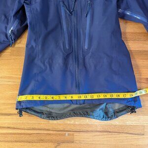 Chest pockets, pit zips, tall collar, longer sleeves and hood that can accommodate a helmet on this waterproof Goretex pro jacket. Small interior chest pocket. Some slight layer separation on the arms and wrists (see photos) but these are merely visual - the jacket is still waterproof. Slightly two-toned with thicker fabric on the arms and shoulders. Truly a stunning purple color - it's bluish, almost like if a sapphire was purple. I'm really sad to give this jacket up purely for the color (that I've yet to see them make again) but I need a bigger jacket for more layers. Great for climbing.