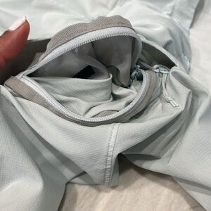 Lightweight windbreaker. Features a sleek design with a hood. Worn with care, but it has a few small stains - please see pics. Can be folded for easy travel