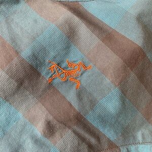 Blue and Gray button down Arc’teryx shirt. Short sleeve. Good condition.