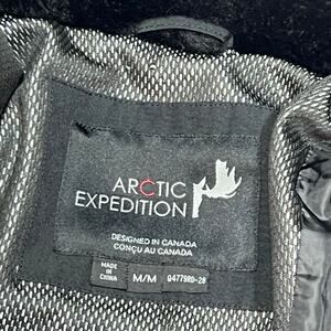 Introducing Arctic Expedition Down Parka Coat in women’s large, black color, designed in Canada, in used good condition, missing one button from a pocket flap.