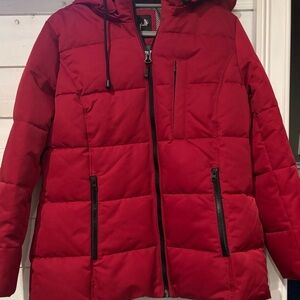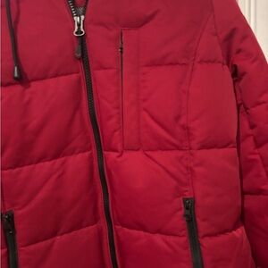 Red puffer jacket by Arctix. Features a cozy hood and sleek zip pockets. Ideal for cold weather.