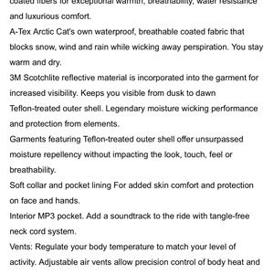 Xl snowmobile jacket in like new conditions. No tears or cuts. Has zipper for additional arctic cat liners. Description of jacket is in pictures.
