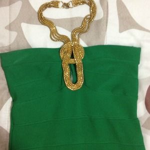 Worn once (sister) Purchased for my summer trip to Vegas, but too big for me. Fits more like a M. Gorgeous & vibrant green bandage dress with unique gold halter. Keyhole front adding to sexy look of the dress. 75% rayon, 25% nylon. Very stretchy.