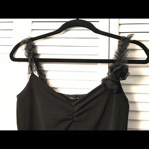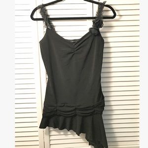 This chic top is extremely flattering on all body types because it has an asymmetrical bottom. The straps have sheer frayed edging along with a frayed black flower in the left corner that connects the strap to the shirt. It's a really cute and a bit unique (not just a plain black tank). Looks great with jeans, white pants and can be dressed up or down depending on occasion.