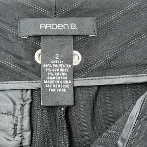Arden B wide leg trouser pants in black with thin, white pinstripes. 2.25" waistband with beltloops. 2 front pockets and one rear pocket with a silver zipper and chain. Silver grommet detail on rear waistband and bottom front pockets. 98% polyester, 1% spandex, 1% rayon. Slight stretch but not in the waistband. Women's size 2. Double side tab closure and one button that is a little loose. Good condition.