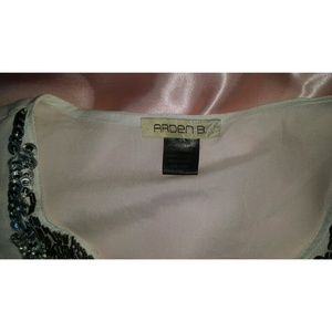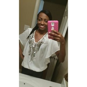 White chiffon top, flowy material, banded bottom, silver embellishments, worn once, can fit up to a medium