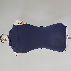This is an Arden B. dark blue form fitting sleeveless top that crisscrosses in the front. Very stretchy material, gathered at the sides. Form fitting in size Medium.