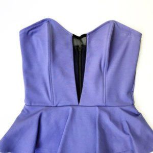 Arden B strapless peplum dress in a beautiful lavender color. Plunging v-neck with mesh covering. Boning in chest for structure. Center back zipper. Worn once and then dry cleaned. Excellent Condition! Some stretch to the fabric. Tag size S. Approximate measurements laying flat: armpit to armpit 15", waist 12.5", Length waist to hem 18.5", length armpit to hem 27". Bundle and Save!