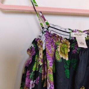 Arden B floral black, white, purple and green floral print oversized satin off the shoulder spaghetti strap flowy blouse with three quarter sleeves with adjustable spaghetti straps