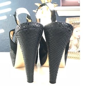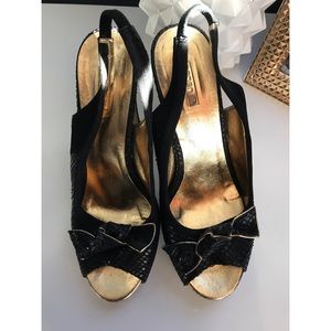Arden B peep toe fish scale heel with sling back. Knotted bow on front of shoes. Comfy and forgiving on the feet!