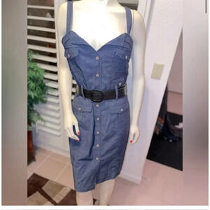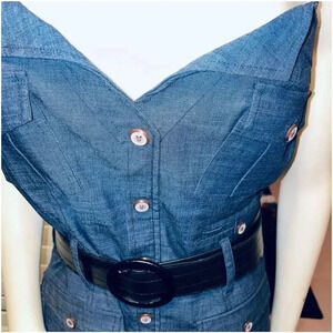Elevate your wardrobe with this stunning Arden B midi dress in a captivating blue denim hue. The sweetheart neckline and wide straps create a flattering silhouette, while the shift dress style ensures comfort and elegance. Crafted from a blend of rayon, cotton, polyester, and spandex, this dress offers a perfect balance of softness and stretch. The button-front closure adds a touch of sophistication, making it ideal for brunches, garden parties, or casual evenings out. Size S, regular fit. Pre-owned in excellent condition.
