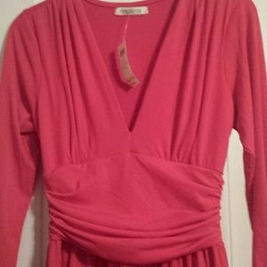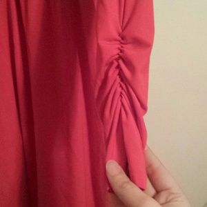 V neck red dress with little crunch belt and long sleeve crunching on the side.