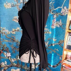 Arden B sz M, black, ruffle and ruched blouse. 90% rayon 10% spandex.
