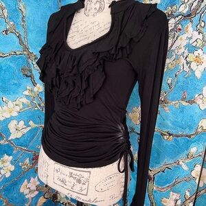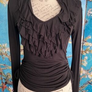 This black, ruffle and ruched Arden B long sleeved blouse has only been worn a couple of times. It’s in perfect condition. The rayon blended with spandex makes it stretchy and very soft to the touch.