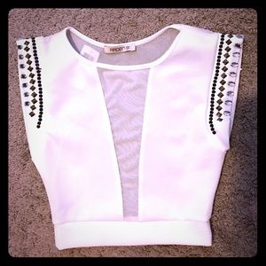 White crop top with jeweled embellishments on the shoulder. See-through v-line mesh panel in the front and open mesh see-through back. Brand-new never worn before.
