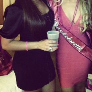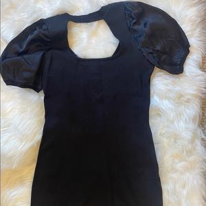 Beautiful lbd from Arden B., size S. Good preworn condition with minor pilling noted throughout, and hole in mesh with missing gem to embellished section (see photo), although I don’t believe it’s noticeable. Honestly one of my favorite dresses because of the way it fit, so very flattering. Features silk puff sleeves, low scoop neckline, cut out back, embellished front midline, all in a soft, stretchy black bodycon fabric.