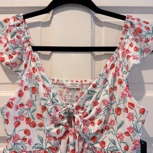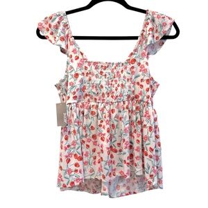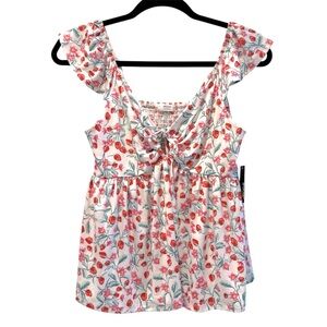 Ardene Strawberry Floral Babydoll Tank Keyhole Tie Front Ruffles White Red XS