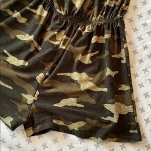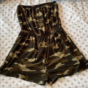 Ardene camouflage print strapless knit romper. Lightweight knit material with gathered elastic top and weight. Looser shorts.