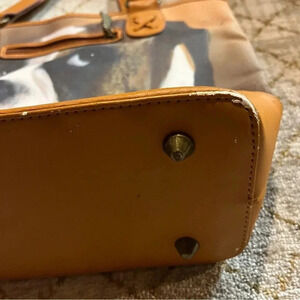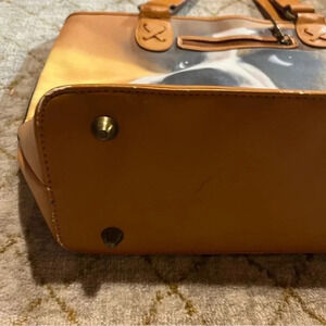 Cute purse but it is very worn- maybe you need this for an outdoor event or something and it could still be used! See all the photos, there is scuffing on the faux leather straps and edges of the bottom. The inside is clean.