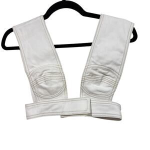 Are You Am I Sprit Top in White. Women's Size XS / Extra Small. Features thick brushed denim, wide shoulder straps with velcro closure, contrast stitch, sleeveless, plunge neckline, lined bust, short cropped length, velcro closure on chest band. Small mark on interior. Archived piece.