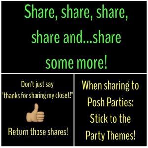 Thanks for taking the time to create this helpful listing! I've been on Poshmark for five months and I'm still learning. It's frustrating when I start sharing items from a closet only to discover it's filled with prohibited items, but I've never reported any of those. Wish I could "unshare". Another thing that bugs me is misspelled words in listings.... but that's a whole other story :/