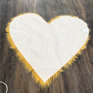 Bright yellow heart-shaped faux fur rug. Soft and fluffy texture.