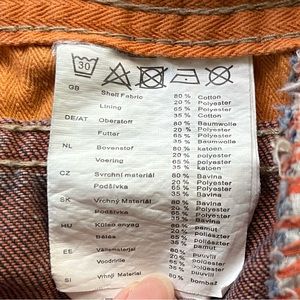 Classic straight leg jeans with large side and back pockets. Length from waist is about 41.5”. In good preowned condition, see pictures. Cotton/polyester material.