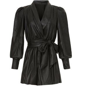 Area Stars Faux Leather Blazer Romper. Black faux leather, collared romper with side zipper closure and long bishop sleeves. Please see pictures for more details and measurements.