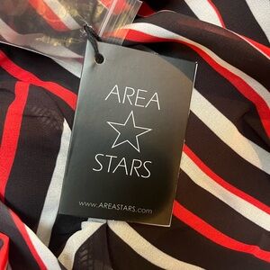 Area Stars NWT dress with vertical stripes of black, red and white. The fabric is sheer polyester lined in black. There are ruffles at the shoulders, wrists and the hem. The neckline is high. The back has covered buttons and a stylish keyhole. This is a transitional dress that can be worn Winter through Fall. Perfect for Easter.