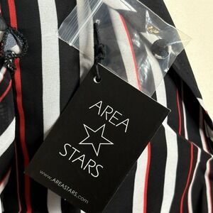 Step out in bold, eye-catching style with this Area Stars mini dress, brand new with tags. Featuring a striking black, red, and white vertical stripe pattern, this dress is designed to flatter and elongate your silhouette. Feminine details like shoulder ruffles, bell sleeves, and a flouncy ruffled hem elevate the look, while the keyhole back with button closure adds a chic touch.