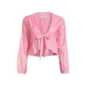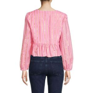 Metallic stripes highlight this feminine top. It has a cropped silhouette with blouson sleeves, a ruffle hem and a flirty front tie.