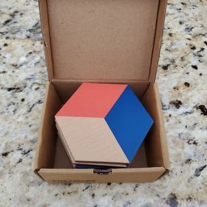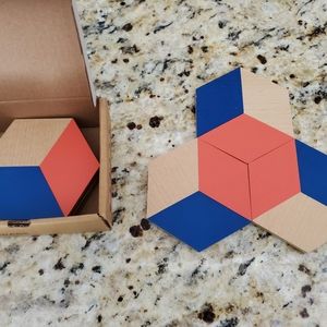 "This set of six coasters can be artfully arranged to form a tiled trivet. The illusion of 3D through color and geometry allows for endless permutations, encouraging playful mosaic building on your table. Ideal as a housewarming gift for those with discerning taste or as decoration for your own intimate gatherings."