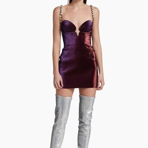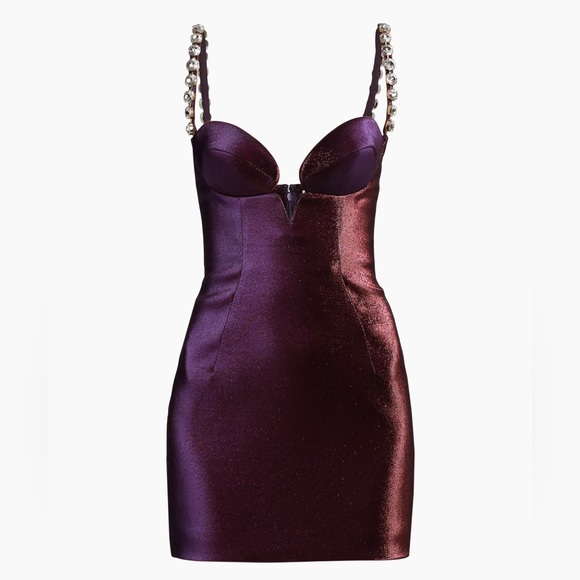 Embellished at the shoulder straps, AREA's charming satin minidress showcases mussel-inspired cups. This fitted style has a center-notch and sleek fitted silhouette.