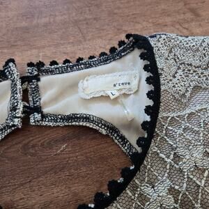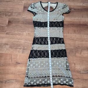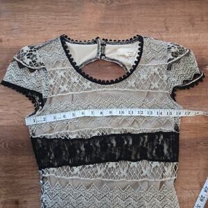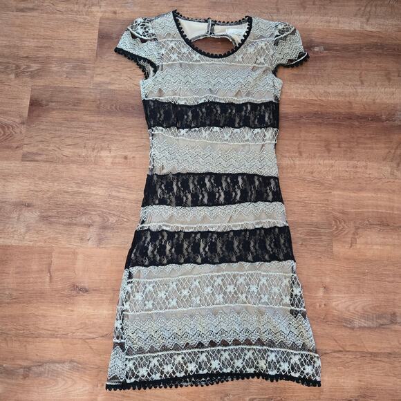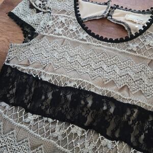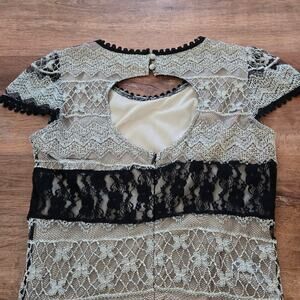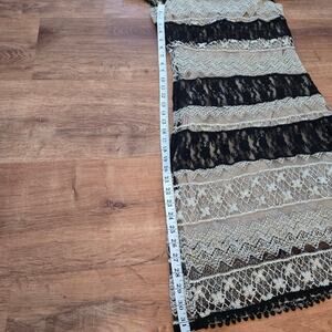 This elegant black and cream lace dress is perfect for any occasion. The intricate lace design adds a touch of sophistication and style. The dress in is great used condition showing minimal signs of wear.