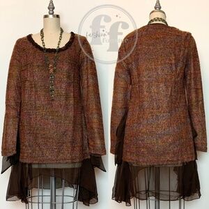 romantic, dreamy, bohemian, boho, chic, elegant, sophisticated, timeless, classic, stylish, feminine, transitional, brown, orange, fall, autumn, thanksgiving, knit, pullover, sweater, tunic, top, with chiffon, sheer, chiffon, hem, bow, bows, women's, unique, fall, autumn, thanksgiving, pullover, sweater, dress, tunic, top, style, outfit, look, fashion, clothing, unique thanksgiving fashion for women, boho thanksgiving fashion, boho fall sweater dress tunic top, boho autumn sweater tunic, a'reve sweater, a'reve top, a'reve tunic, a'reve dress, a'reve sweater dress, areve sweater, areve top, areve tunic, areve dress