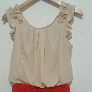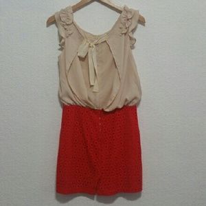 Boutique Dress. Feminine a'reve dress in cream and red-orange. Top is light weight and flowy. Bottom is a medium weigh crocheted lace that hangs perfectly! Back ties loosely at the nape of the neck. Length is about 34 inch from top of the shoulder seam to the bottom hem. Excellent/very good Pre-owned condition.