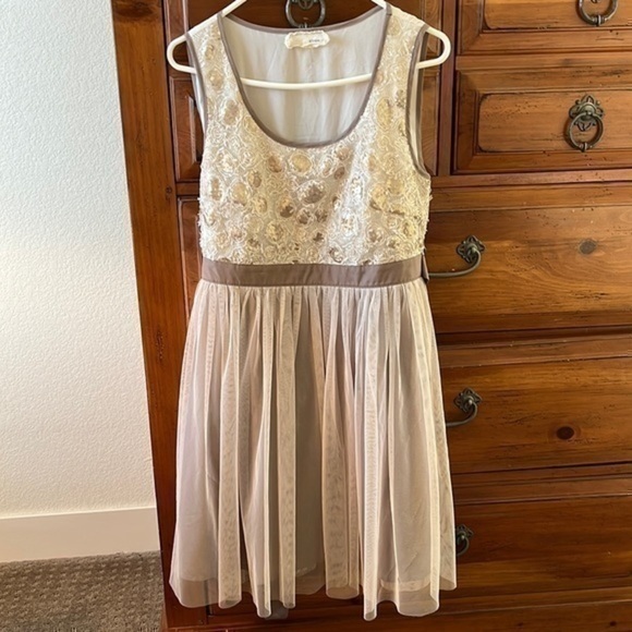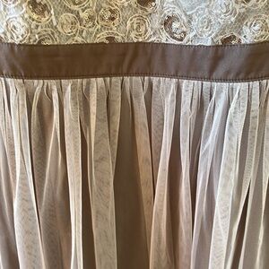 A’reve Girls sleeveless dress with tie in back and beautiful fabric, size large. Pit to pit is 18.5 inches and length is approximately 37 inches.