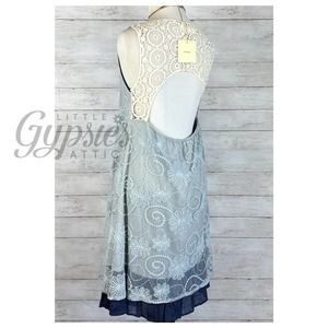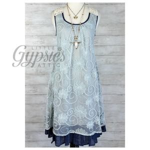 Daisy Embroidery Lace Overlay Dress with Crochet Open Back Detail, Navy Ruffle Hem.