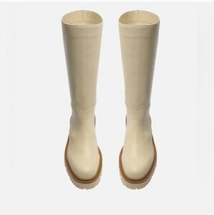 Off-white leather boot. The style features a mid-shaft, a rounded toe and a low rubber heel with a rugged, chunky lug sole with a stacked detailing. It has a snug-fitting vamp and no closure.