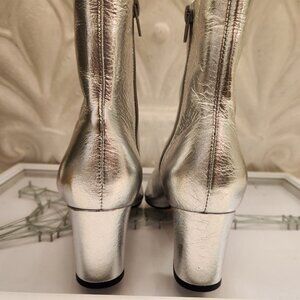 Silver leather ankle boot. The style features a short shaft, a mid-block heel, and a pointed toe. It has a snug fit and a zipper closure on the inner side of the shaft.