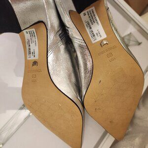 Arezzo Silver " Jemma" Block Booties. Leather. NIB. Size: Various. NIB/Original box/packaging. They have the crinkle look. No rips/stains/scuffs/tears/peeling/flaws. I am assuming floor models or returns, I see very scant dirt markings on the bottoms. Boxes have some damage. Smoke free home. No odors. All offers are welcome. Thank you!