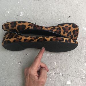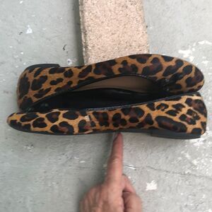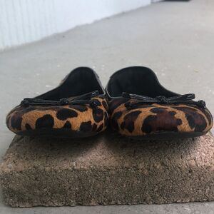 Pony hair with the leopard print. Super cute, but not perfect. The marks on the back of the heel do not show when you’re wearing. Soles are like new. They run a little small