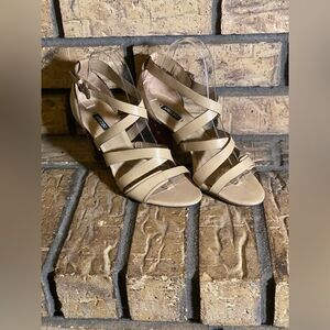 Has wear-see photos. On the back there is some rubbing and the fabric under the pad of the foot is peeling but could easily be fixed