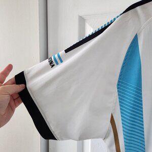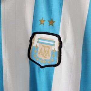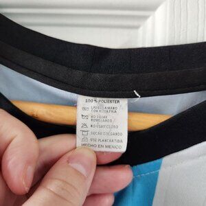 This is a soccer jersey for the Argentina team. It is blue and white in a vertical striped pattern. It has short sleeves and a v-neck line. It is lightweight and comfortable to wear with stretch. It is in excellent pre-owned condition with no holes or rips. There are a number of small stain marks, all shown in photos. Bundle with other items in my closet to get the most out of shipping!