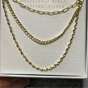 A mixed trio of chain styles comprises this multistrand necklace for an easy layered look in sterling silver or sterling silver plated in 14-karat gold.