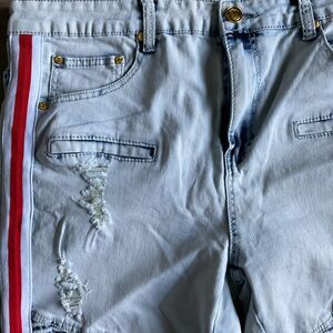 Make a bold statement with these Argonaut Nation distressed moto jeans in size 36x32. Designed for standout streetwear style, these jeans feature rugged distressing, moto panel details, and eye-catching red and white side stripes. A perfect fusion of urban edge and everyday comfort.