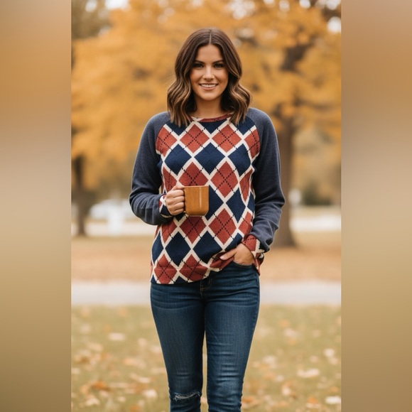 Argyle Pattern Blouse - Navy and Rust Women’s Size Medium by Sun N Moon