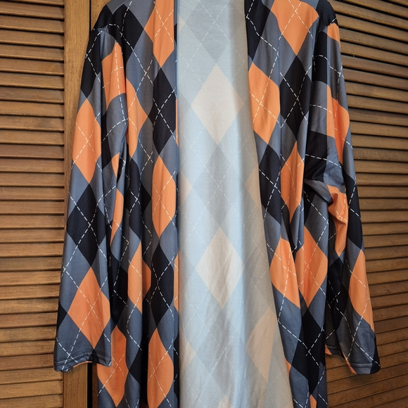 Stylish cardigan with an argyle pattern in orange, gray, and black. Perfect for a chic look.